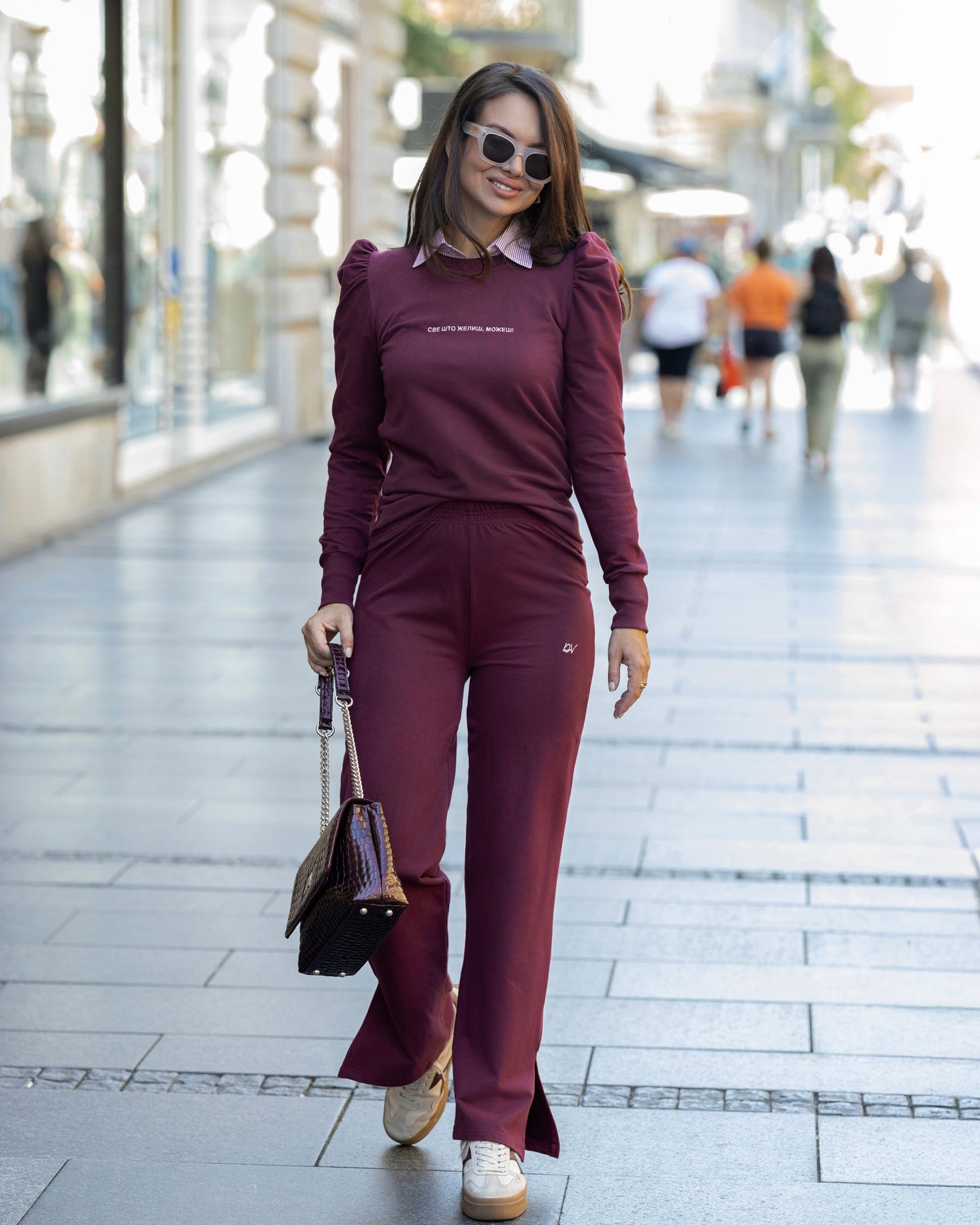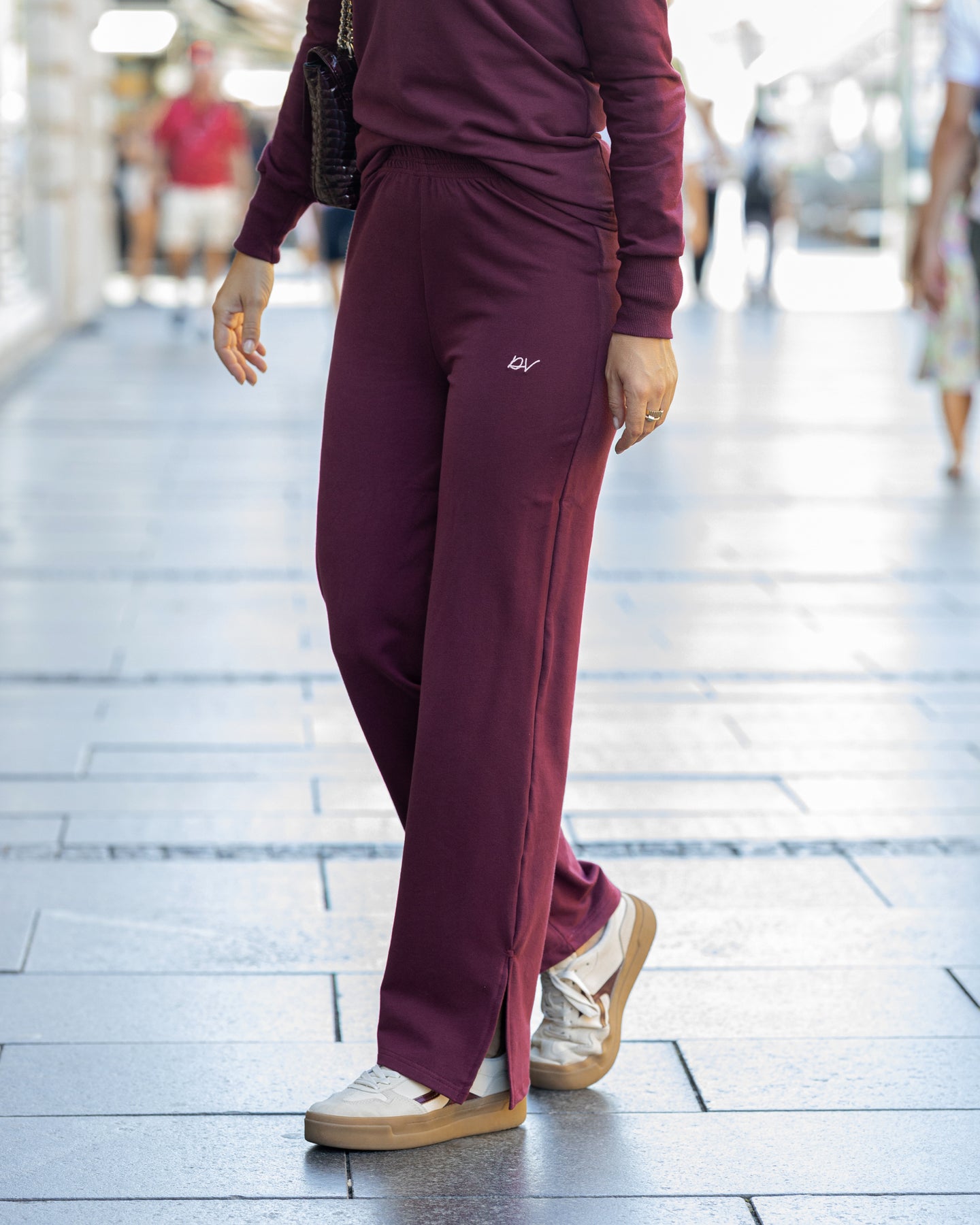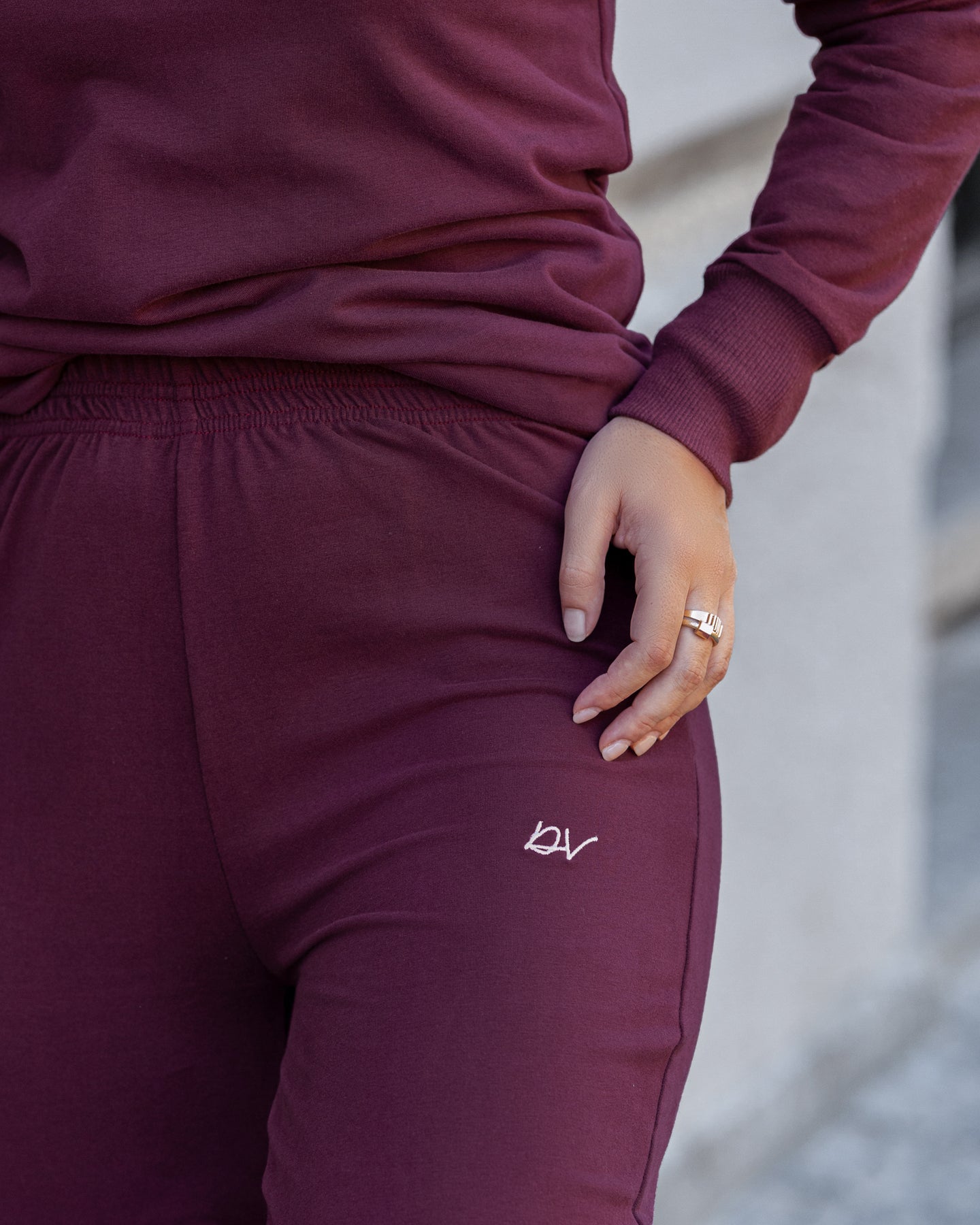 Donji deo trenerke zvonastog kroja od brušenog pamuka u bordo boji, nestvarno mekan i prijatan za nošenje. Osim donjeg dela u ponudi imamo i duks u istoj boji koja je od punijeg pamuka ali zajedno čine savršen set.