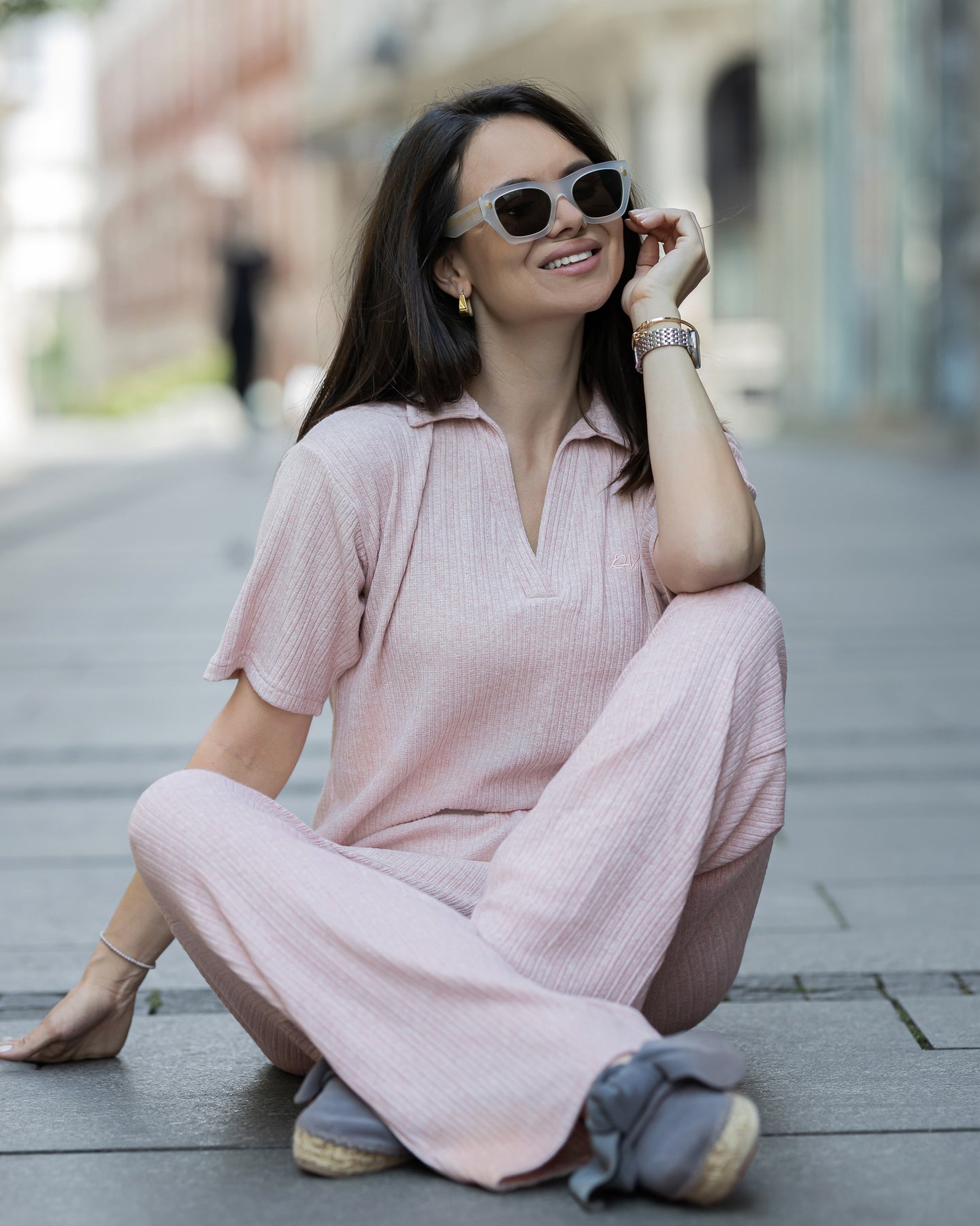 Must-have trikotažni komplet u kajsija boji sa kockastim tkanjem pruža savršenu ravnotežu između udobnosti i elegancije. Neverovatne je mekoće i udobnosti a ujedno i upečatljivog kroja koji uz adekvatan aksesoar i obuću može delovati izuzetno modno! Gornji deo kratkih rukava sa klasičnom kragnom daje uredan i doteran izgled, dok ležeran, širi kroj omogućava potpunu slobodu pokreta. Donji deo sa dubokim strukom i zvonastim nogavicama izdužuje siluetu na suptilan način. Ovaj set je idealan za dnevne prilike–šetnju u prirodi, kafu u gradu, uz osećaj lakoće i stila. Veličina je univerzalna ali set zbog ležernog kroja i širine lastiša u pojasu pokriva S, M i L veličinu. Dužina gornjeg dela je 58 cm a dužina nogavice je 84 cm iznutra i 112 cm spolja. Za lakšu orijentaciju o dužini pogledajte poslednju sliku. Set prati na 30 stepeni (program za osetljivo rublje) bez sušenja u mašini.