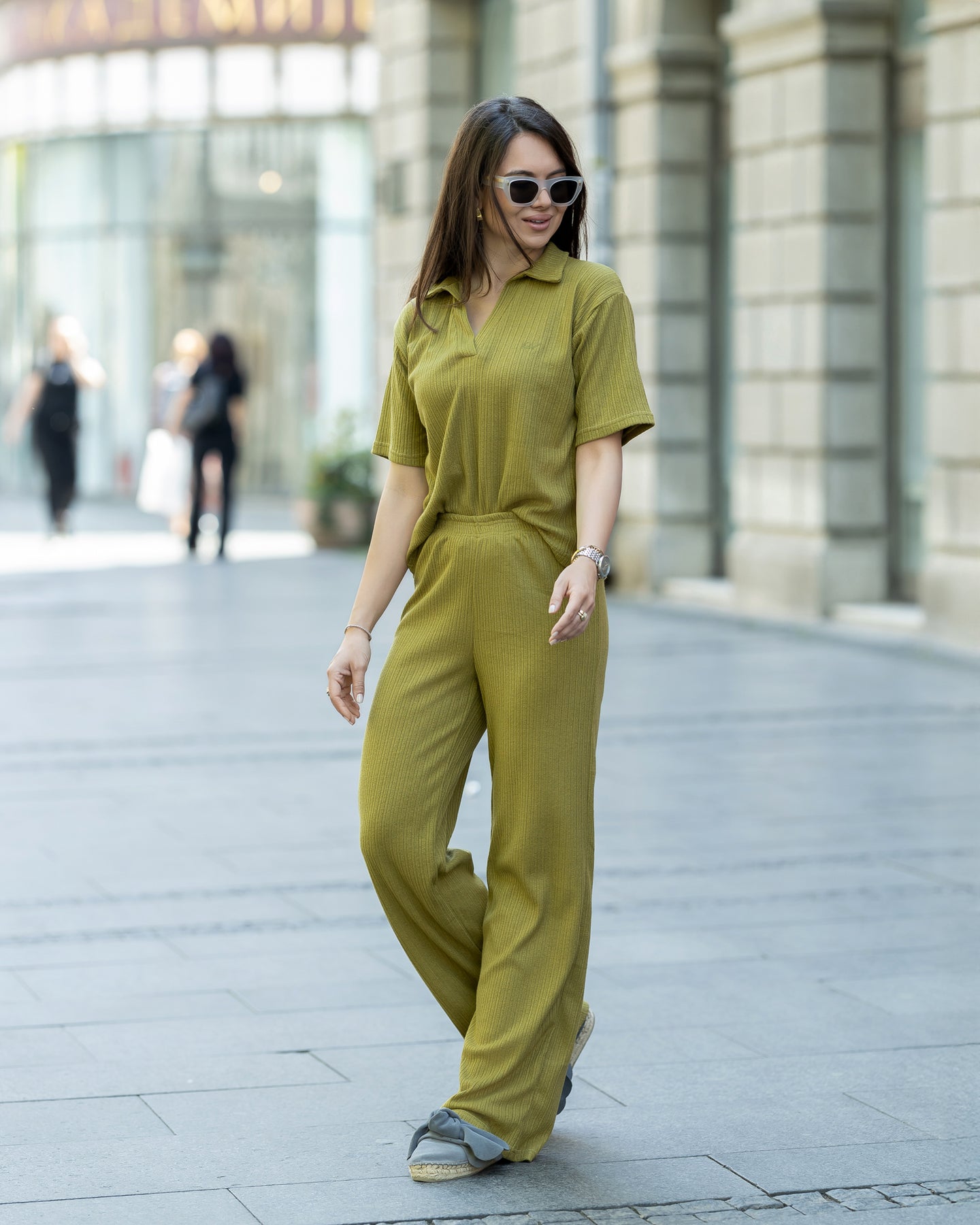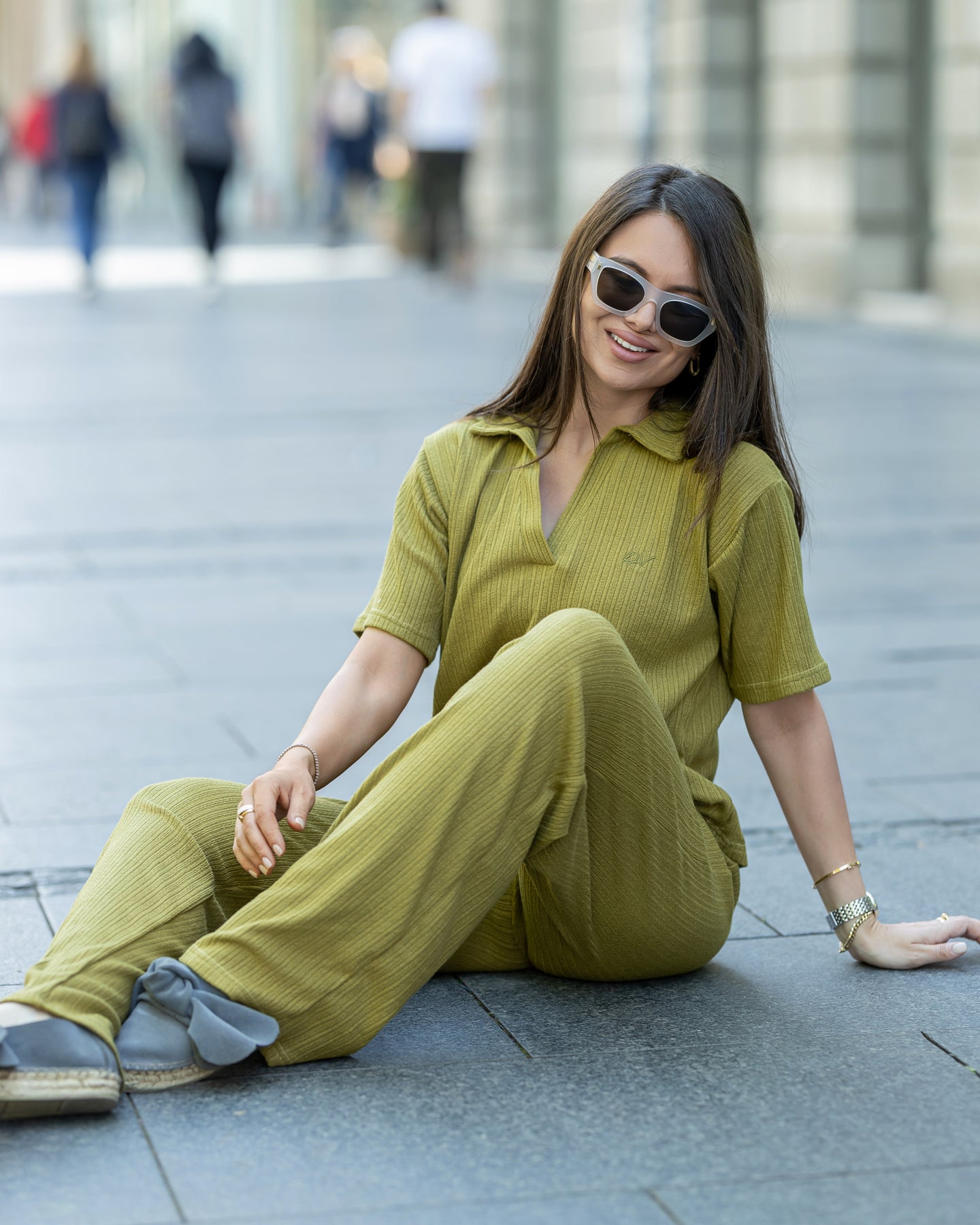 Must-have trikotažni komplet u pistać zelenoj boji sa prugastim tkanjem pruža savršenu ravnotežu između udobnosti i elegancije. Neverovatne je mekoće i udobnosti a ujedno i upečatljivog kroja koji uz adekvatan aksesoar i obuću može delovati izuzetno modno! Gornji deo kratkih rukava sa klasičnom kragnom daje uredan i doteran izgled, dok ležeran, širi kroj omogućava potpunu slobodu pokreta. Donji deo sa dubokim strukom i zvonastim nogavicama izdužuje siluetu na suptilan način. Ovaj set je idealan za dnevne prilike–šetnju u prirodi, kafu u gradu, uz osećaj lakoće i stila. Veličina je univerzalna ali set zbog ležernog kroja i širine lastiša u pojasu pokriva S, M i L veličinu. Dužina gornjeg dela je 58 cm a dužina nogavice je 84 cm iznutra i 112 cm spolja. Za lakšu orijentaciju o dužini pogledajte poslednju sliku. Set prati na 30 stepeni (program za osetljivo rublje) bez sušenja u mašini.