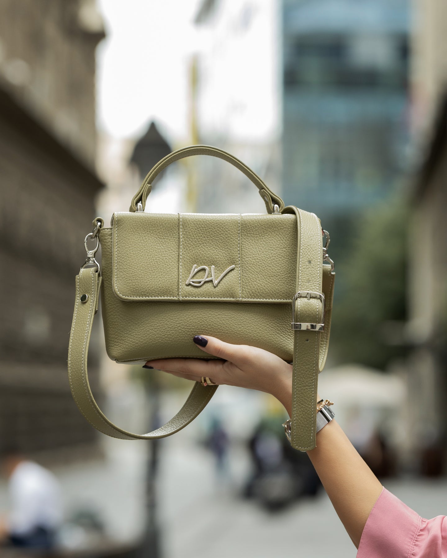 Kožna tašna u pistać zelenoj boji, predstavlja jedan premium proizvod u našoj limitiranoj kolekciji aksesoara. Tašna je kompletno ručno radjena sa vrhunskim kvalitetom izrade i završne obrade što je čini izuzetno trajnom. Dimenzije tašne su 20x25x10 cm. Srebrni detalji su od nerðajućeg čelika i dodatno joj daju na upečatljivosti. Možete je nositi preko ramena ili na jedno rame. U ponudi imamo i novčanik ili futrolu za kartice od iste kože, što predstavlja savršen set.