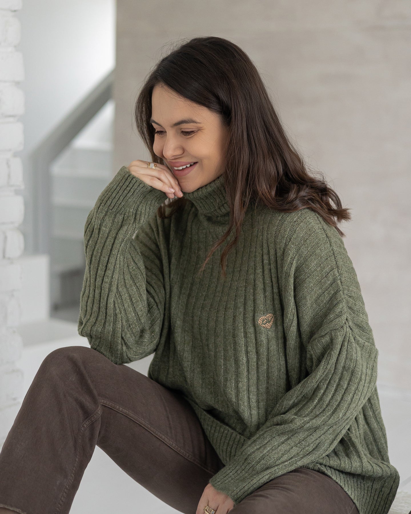 Zimski džemper rebrastog tkanja i nestvarne mekoće pod rukom, oversized kroja sa rol kragnom i sitnim vezenim detaljem. Ovo je jedan nosiv i praktičan komad za zimske dane za maksimalan osećaj ušuškanosti i udobnosti! Dužina džempera 65 cm, dužina rukava 55 cm, poluobim 68 cm.