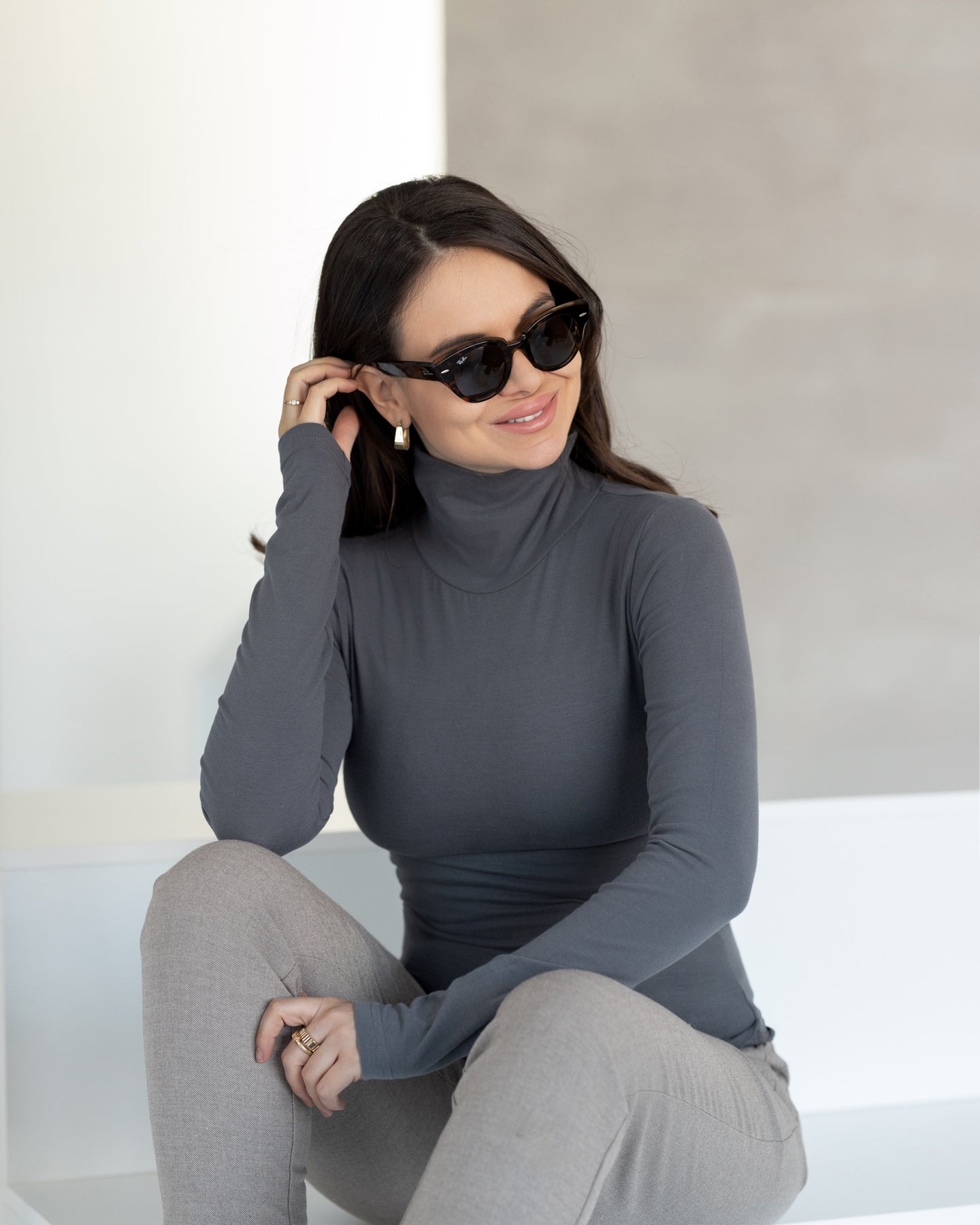 Antracit siva rolka od organskog pamuka nestvarne mekoće pod rukom, savršeno prianja uz vaše telo i stvara vam osećaj udobnosti i lakoće. Uski rukavi izuzetno dugog kroja daju joj na ženstvenosti. Kragnu možete podvrnuti da bude polu-rolka (preporuka je na unutra).