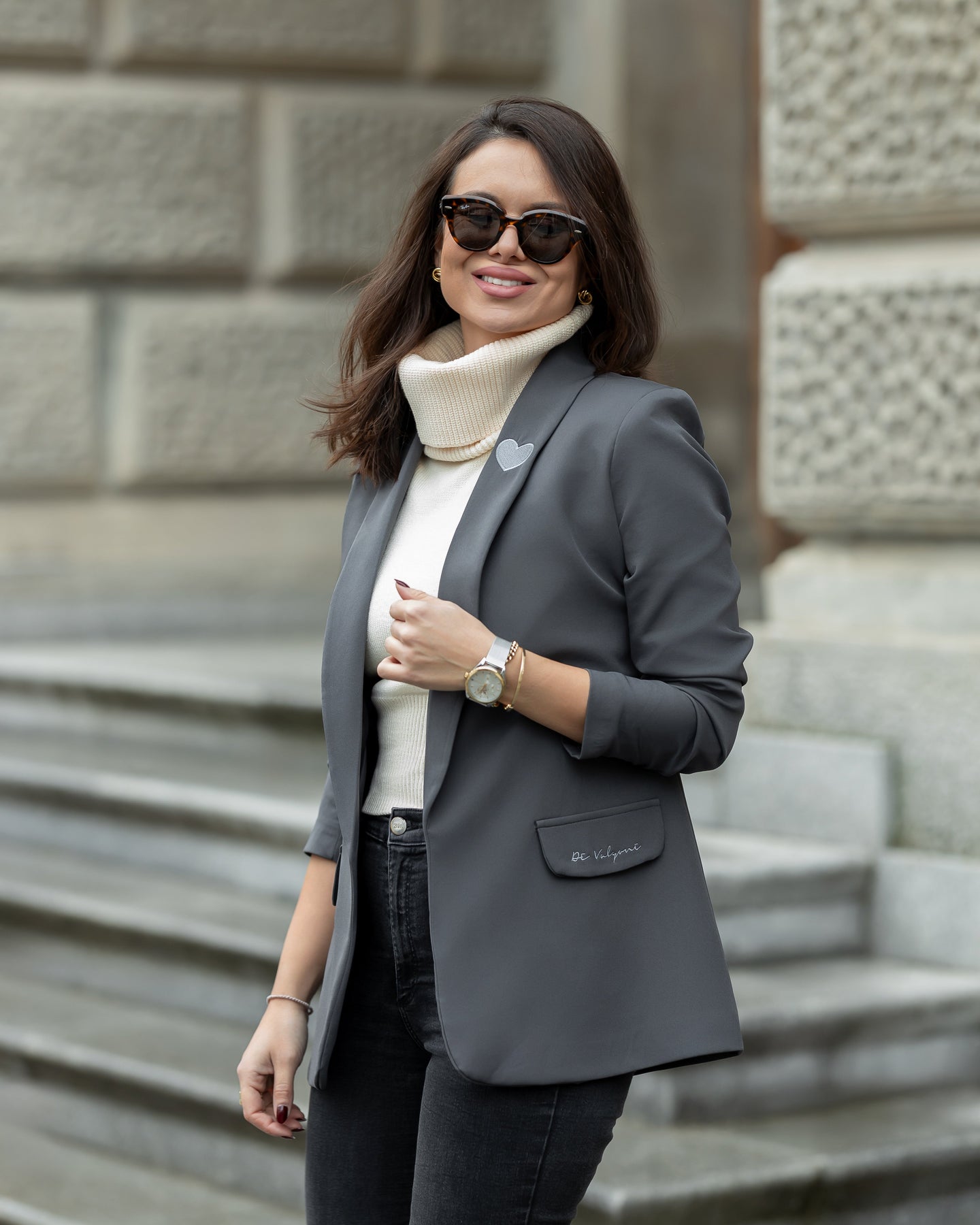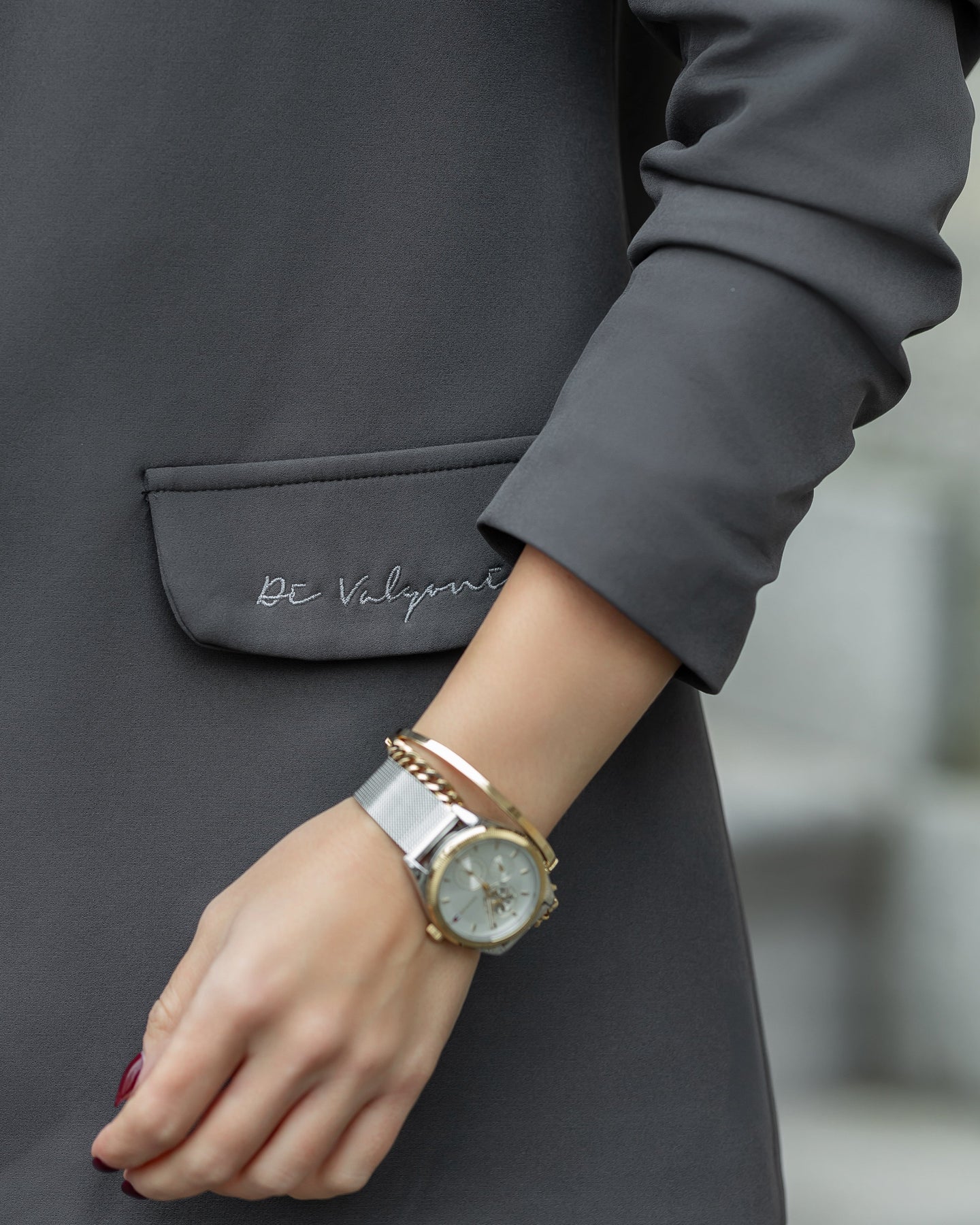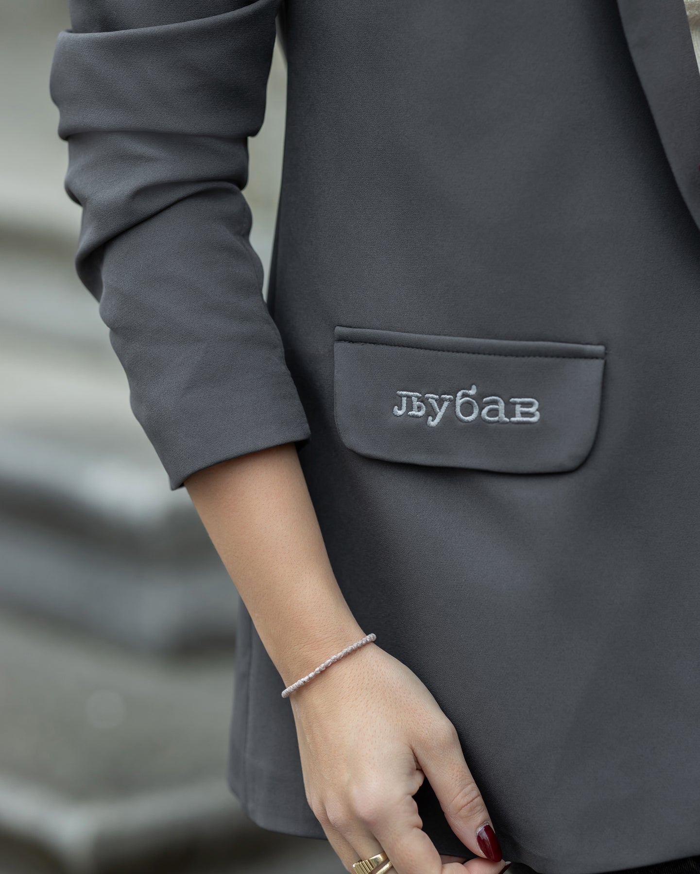 Sako za sve sezone u antracit sivoj boji, nosiv u poslovnim i svakodnevnim prilikama! Predstavlja komad koji je potreban svačijem garderoberu i bezbroj je kombinacija u kojima ga možete uklopiti! Ovaj model ima svedenu formu, dužeg je kroja a rukavi su naborano sašiveni kako bi imao i notu ležernosti. Kompletno je postavljen, ima naramenice i vezene detalje na sebi. Dužina sakoa 72 cm, dužina rukava 56 cm. Rukavi su ušiveni tako da se nose nabrano.